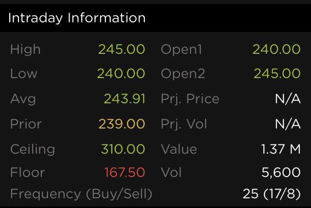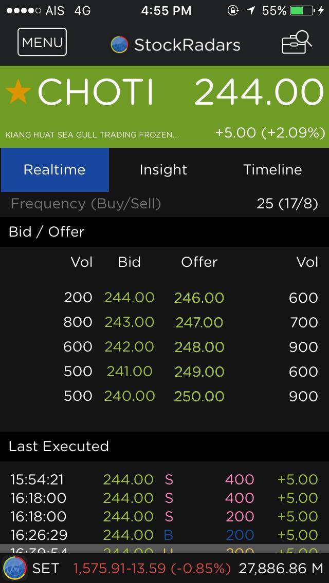 อย่างที่เห็น Bid/Offer ค่อนข้างกระโดด และ Volume รวมทั้งวันไม่เยอะมาก  5,600 หุ้น (1.37 ล้านบาท) แต่ราคาวิ่งไปไกลทีเดียว .. ถ้าอยากรู้ลึกอีกนิด เปิดแอป StockRadars แล้วลองขยับขึ้นไปดูข้างบน ในกรอบ ‘Intraday Information’
