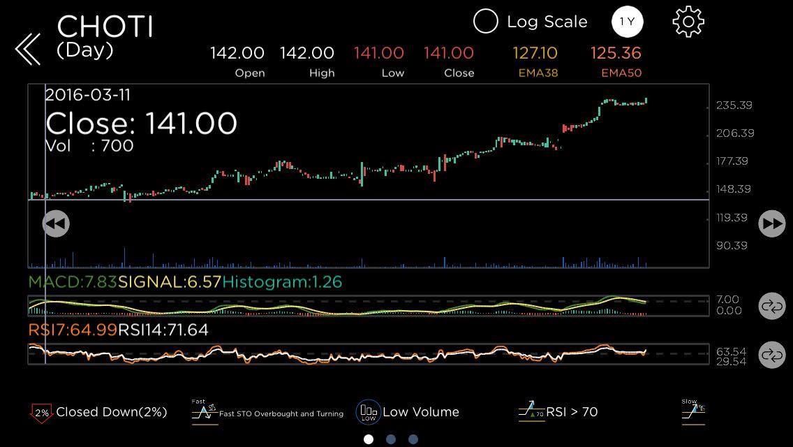ในช่วงที่ผ่านมา วันที่ราคาบวกอย่างแร๊ง (2017-03-17) รวมวอลุ่มที่เค้าซื้อขายกัน อยู่ที่ 6,800 หุ้น และที่สำคัญ Radars ตรวจเจอสัญญาณหลายอย่างเลย เช่น ‘High Volume Gainer’ ที่แสดงการเคลื่อนไหวอย่างมีนัยสำคัญของวอลุ่ม และก็ยังมีเรดาร์พื้นฐานที่น่าสนใจอีกนะ .. เช่น ‘No Debt Radars’ คือ บริษัทนี้ไม่มีหนี้สินระยะยาวเลย รวมทั้ง ตรวจเจอเรดาร์ ‘Current Ratio More Than 2’ คือ อัตราส่วนทุนหมุนเวียนที่บ่งบอกถึง สภาพคล่องของกิจการที่มีสินทรัพย์หมุนเวียนมากพอจะชำระหนี้ระยะสั้น (ซึ่งเรดาร์จะส่งสัญญาณตรวจสอบอยู่ทุกวัน และเก็บอยู่ใน ‘Time Machine’ ด้านล่างกราฟนี่ล่ะครับ)