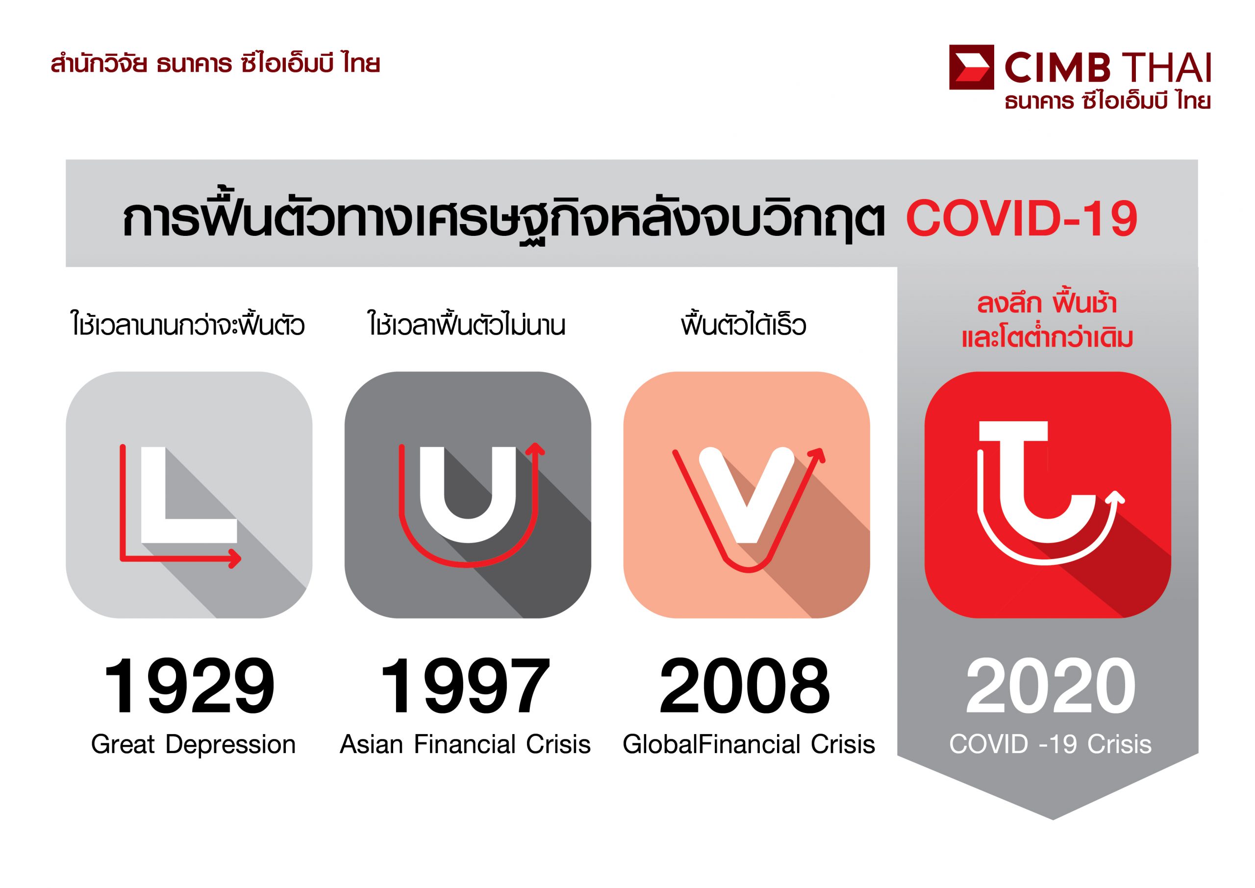 - ‘U’ คือ วิกฤตต้มยำกุ้ง (Asian Financial Crisis) ปี 1997 เกิดจากฟองสบู่ภาคอสังหาริมทรัพย์และตลาดหุ้นแตกลามสู่วิกฤติการเงินในไทยและหลายประเทศในเอเชีย การบริหารอัตราแลกเปลี่ยนที่ผิดพลาดนำไปสู่การลอยตัวค่าเงินบาท เศรษฐกิจไทยหดตัวแรง แต่ใช้เวลาฟื้นตัวไม่นาน เพราะไทยไม่มีปัญหาการว่างงานสูง และการที่ค่าเงินบาทอ่อนช่วยเรื่องการส่งออก การฟื้นตัวเป็นรูปตัว U