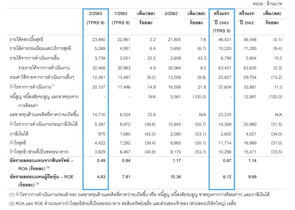 สำหรับไตรมาสที่ 2/2563 ธนาคารและบริษัทย่อยมีกำไรจากการดำเนินงาน เท่ากับ 20,107 ล้านบาท เพิ่มขึ้นร้อยละ 14.9 เมื่อเปรียบเทียบกับไตรมาสที่ 1/2563 โดยมีสาเหตุหลักจากรายได้ดอกเบี้ยสุทธิและรายได้จากการดำเนินการอื่นๆ ที่เพิ่มขึ้น และจากค่าใช้จ่ายจากการดำเนินงานที่ลดลง อย่างไรก็ตาม เนื่องจากมีการตั้งสำรองผลขาดทุนด้านเครดิตที่คาดว่าจะเกิดขึ้นที่สูงขึ้น ส่งผลให้กำไรสุทธิส่วนที่เป็นของธนาคาร เท่ากับ 3,829 ล้านบาท ลดลงร้อยละ 40.8 เมื่อเปรียบเทียบกับไตรมาสที่ 1/2563