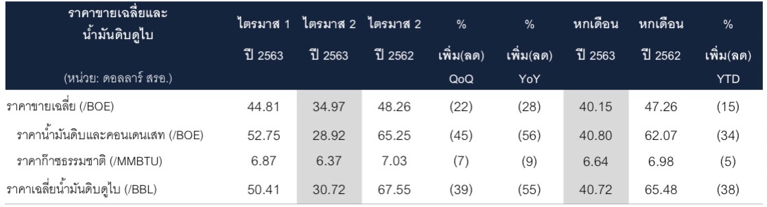 ปตท.สผ. เผยผลดำเนินงานไตรมาส 2/2563 กำไรสุทธิที่ 134 ดอลลาร์ สหรัฐอเมริกา (สรอ.) ลดลง 51% เทียบกับไตรมาสก่อนหน้า โดยหลักมาจากปริมาณความต้องการพลังงานที่ลดลง และราคาขายที่ปรับตัวลง ตามความผันผวนของราคาน้ำมันในตลาดโลก