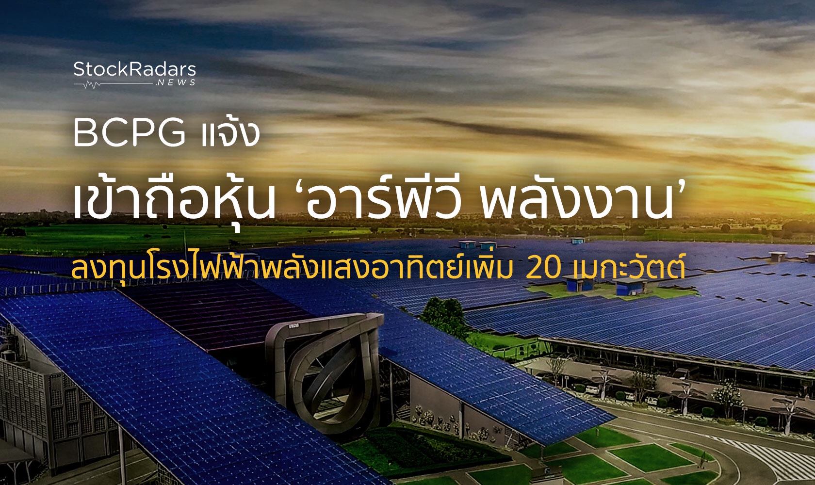 บริษัท บีซีพีจี จำกัด (มหาชน) ได้แจ้งต่อตลาดหลักทรัพย์ฯ ระบุว่าในวันที่ 31 กรกฎาคม 2563 ได้ลงนามในสัญญาซื้อขายหุ้นกับบริษัท อีเทอร์นิตี้ พาวเวอร์ จำกัด (มหาชน) หรือ EP เพื่อเข้าลงทุนในโครงการโรงไฟฟ้าพลังงานแสงอาทิตย์ขนาดกำลังการผลิตตามสัญญาซื้อขายไฟฟ้ารวม 20 เมกะวัตต์ โดยการซื้อหุ้นร้อยละ 99.99 ในบริษัท อาร์พีวี พลังงาน จำกัด (RPV)