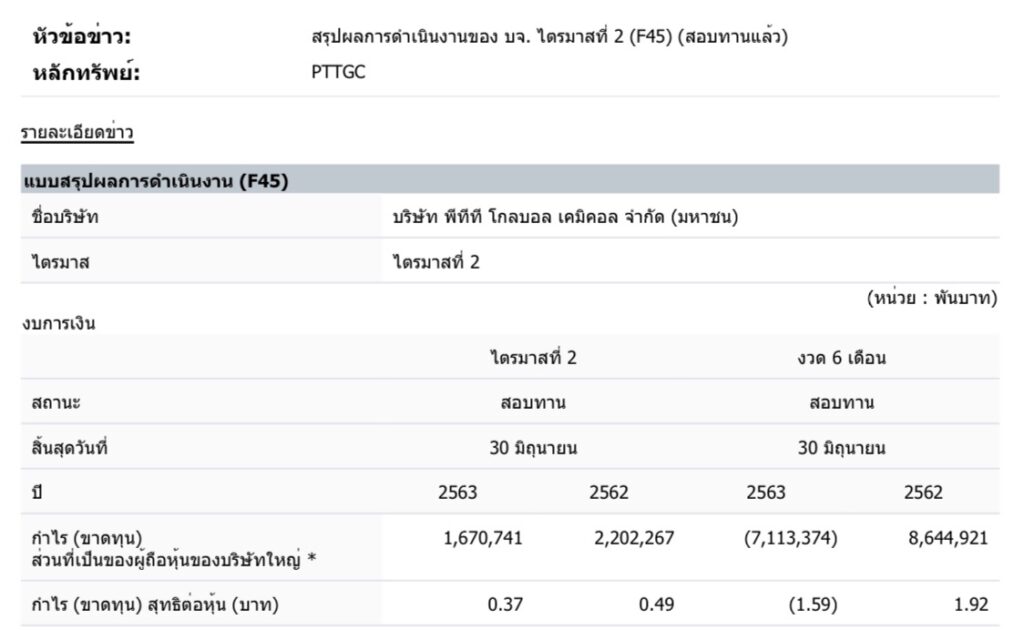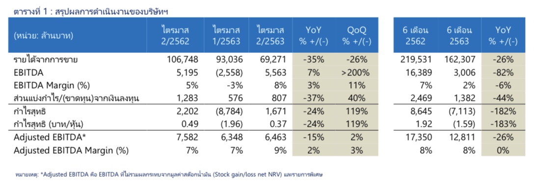 จากผลประกอบการไตรมาส 2/2563 บริษัท พีทีที โกลบอล เคมิคอล จำกัด (มหาชน) หรือ PTTGC มีรายได้จากการขาย 69,271 ล้านบาท ลดลง 26% QoQ และลดลง 35% YoY โดยกำไรจากการดำเนินงาน (ไม่รวมผลขาดทุนจากสต็อกน้ำมัน และการกลับรายการมูลค่าสุทธิที่จะได้รับของสินค้าคงเหลือให้เท่ากับมูลค่าสุทธิที่จะได้รับ กำไรทางบัญชีจากอัตราแลกเปลี่ยน และผลขาดทุนจากตราสารอนุพันธ์เพื่อประกันความเสี่ยง) ในไตรมาสนี้อยู่ที่ 1,409 ล้านบาท เพิ่มขึ้น 25% QoQ โดย Adjusted EBITDA อยู่ที่ 6,463 ล้านบาท เพิ่มขึ้น 2% QoQ ลดลง 15% YoY