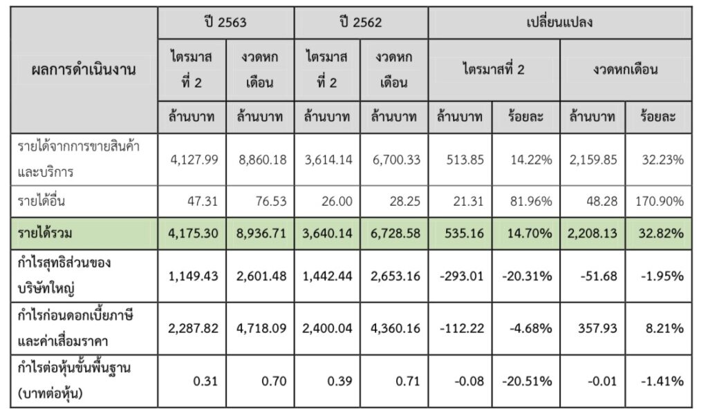 ซึ่งรายได้หลักเป็นในส่วนของ รายได้จากการขายน้ำมันไบโอดีเซลเพิ่มขึ้น 68.86% YoY โดยราคาเฉลี่ย (บาท/ลิตร) ปรับสูงขึ้น 76.16% YoY และราคาปรับขึ้น 99.33% หากเปรียบเทียบกับครึ่งแรกในปี 2562 โดยหลักมาจากการที่กระทรวงพลังงานส่งเสริมให้ใช้น้ำมัน B100 มากขึ้น