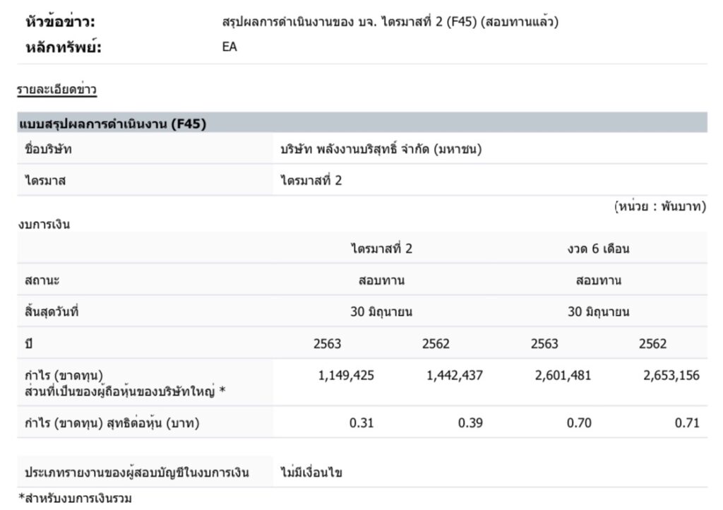 บริษัท พลังงานบริสุทธิ์ จำกัด (มหาชน) หรือ EA ได้รายงานผลดำเนินงานไตรมาส 2/2563 และงวดครึ่งปีแรก 2563 ระบุครึ่งแรกปีนี้ รายได้รวม 8,936.71 ล้านบาท เพิ่มขึ้น 32.82% จากช่วงเดียวกันของปีก่อน และกำไรงวดไตรมาส 2/2563 อยู่ที่ 4,175.30 ล้านบาท เพิ่มขึ้น 14.7% YoY