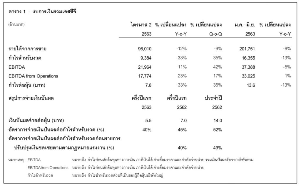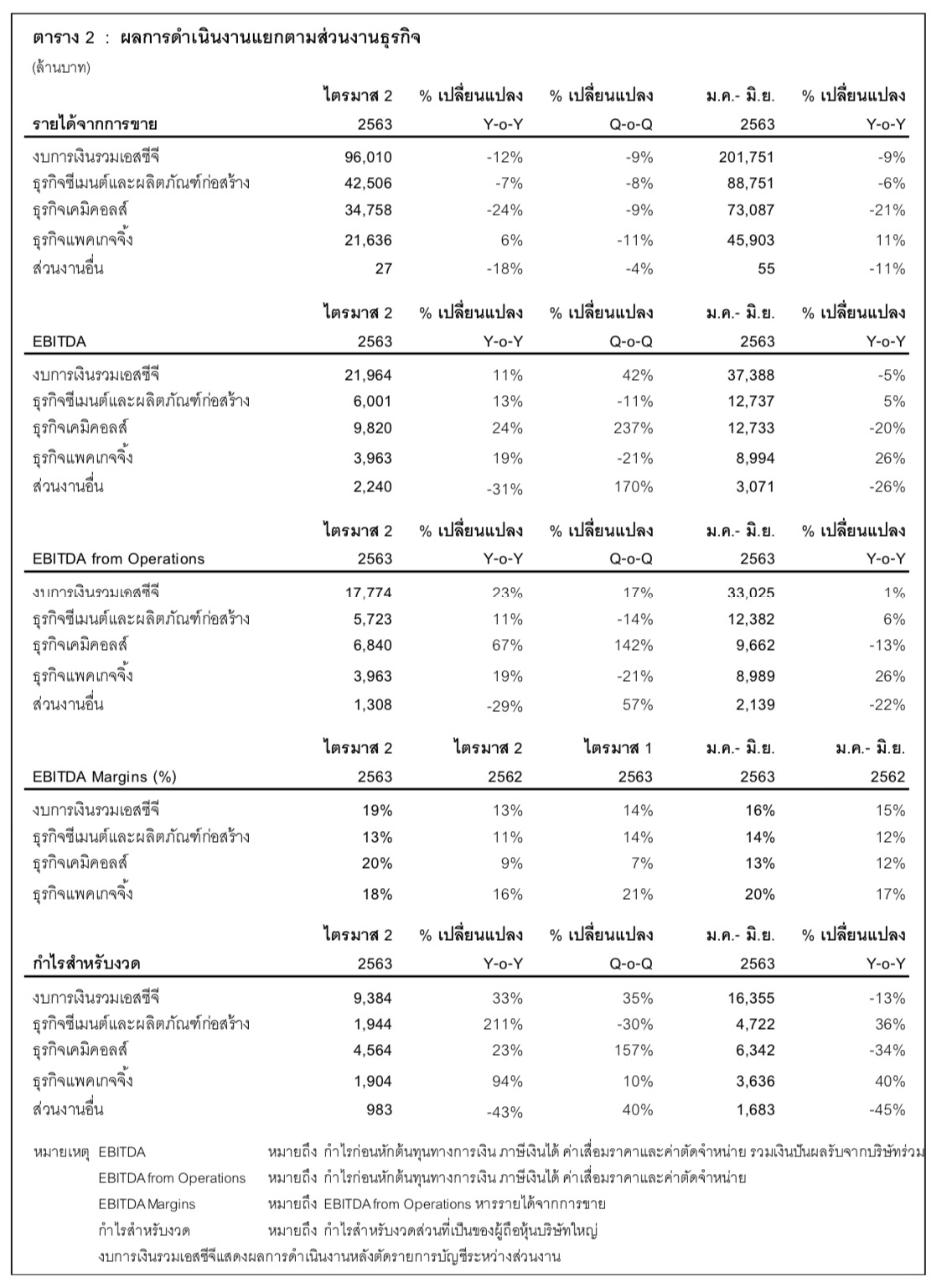 บริษัท ปูนซีเมนต์ไทย จำกัด (มหาชน) หรือเอสซีจี (ชื่อหุ้น SCC) ได้เปิดเผยผลดำเนินงานไตรมาส 2/2563 และงวดครึ่งปีแรก 2563 โดยกำไรในไตรมาสนี้อยู่ที่ 9,384 ล้านบาท เพิ่มขึ้น 35% QoQ จากผลดำเนินงานของธุรกิจเคมิคอลส์ดีขึ้น EBITDA เท่ากับ 21,964 ล้านบาท เพิ่มขึ้น 42% QoQ เนื่องจากเป็นช่วงที่มีเงินปันผลรับจากบริษัทร่วม ขณะที่รายได้จากการขาย 96,010 ล้านบาท ลดลง 9% QoQ เนื่องจากธุรกิจหลักมีรายได้ลดลง