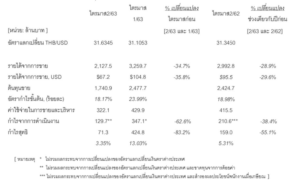 โดยยอดขายในรูปเงินสกุลดอลลาร์สหรัฐ ลดลง 35.8% จากไตรมาสก่อน และลดลง 29.6% เมื่อเทียบกับช่วงเดียวกันของปีก่อน จากวิกฤตเศรษฐกิจที่กระทบต่ออุตสาหกรรมยานยนต์ เนื่องจากการระบาดของโควิด-19 และมาตรการ Lock down ในหลายประเทศที่บริษัทดำเนินธุรกิจอยู่