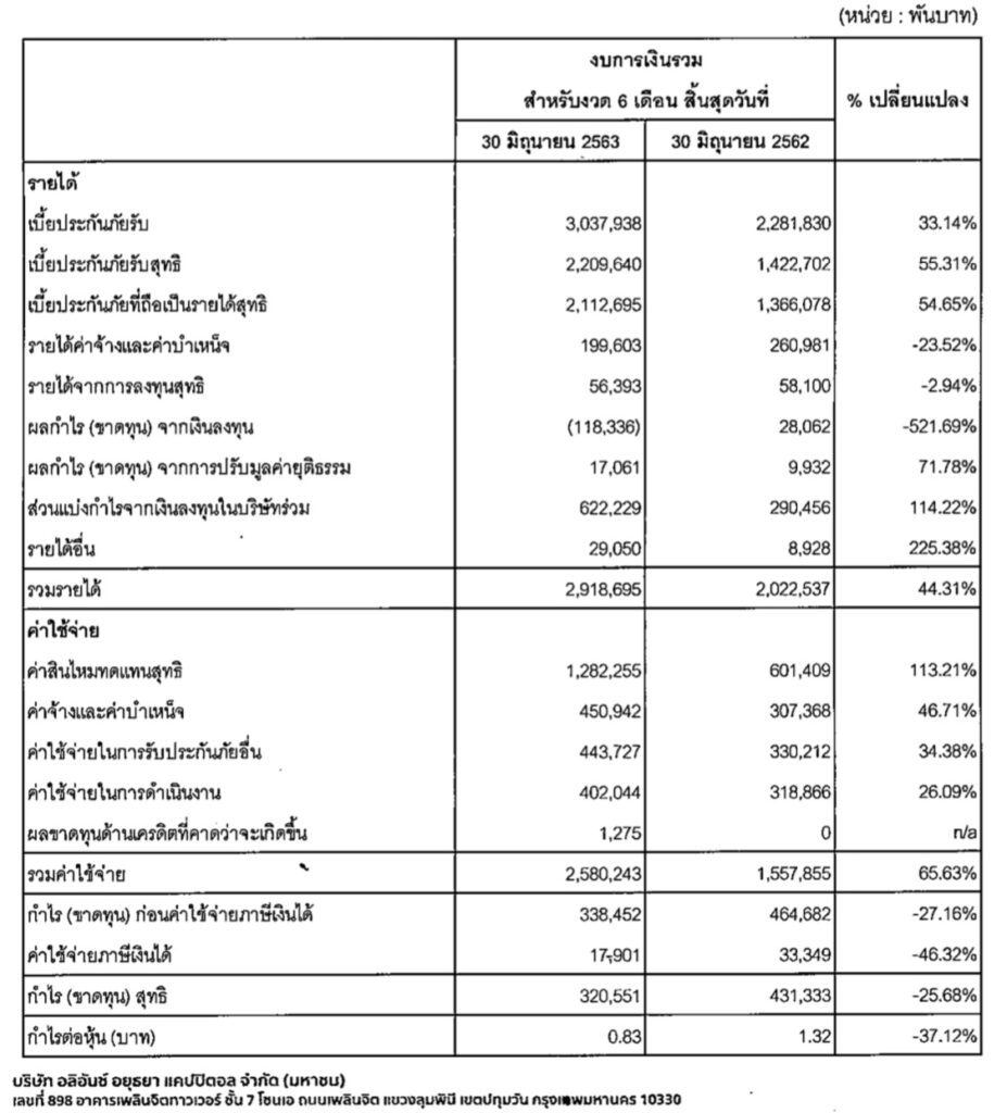 บริษัท อลิอันซ์ อยุธยา แคปปิตอล จำกัด (มหาชน) หรือ AYUD ผู้ลงทุนในธุรกิจประกันภัย ประกันชีวิต ประกันวินาศภัยและอื่นๆ ได้เปิดเผยถึงผลดำเนินงานงวดครึ่งปีแรก 2563 ระบุรายได้จาก ‘เบี้ยประกันภัยรับ’ ในรอบครึ่งปีเพิ่มขึ้น 33% YOY จากการขยายตัวของธุรกิจ เป็นผลมาจากการรับโอนกิจการทั้งหมดของบริษัท อลิอันซ์ ประกันภัย จำกัด (มหาชน) เมื่อวันที่ 30 เม.ย. 2562