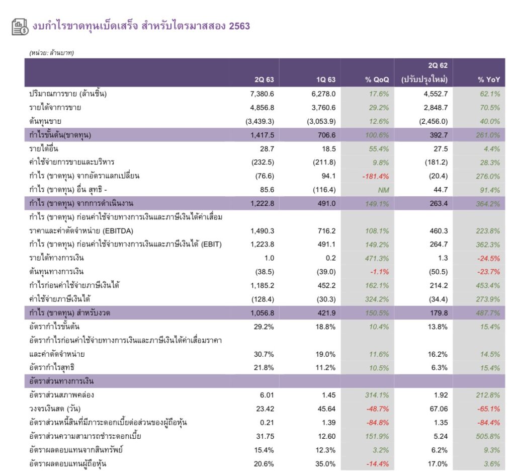 ทั้งนี้ บริษัทมีต้นทุนทางการเงินคงที่ และภาษีจ่ายที่เพิ่มขึ้นจากผลประกอบการที่เพิ่มขึ้น แต่อัตรากำไรหลังภาษีเงินได้ (PBT) เพิ่มขึ้นอย่างมีนัยสำคัญจาก 11.3% ในไตรมาส 1/2663 เป็น 21.8% ในไตรมาส 2/2563