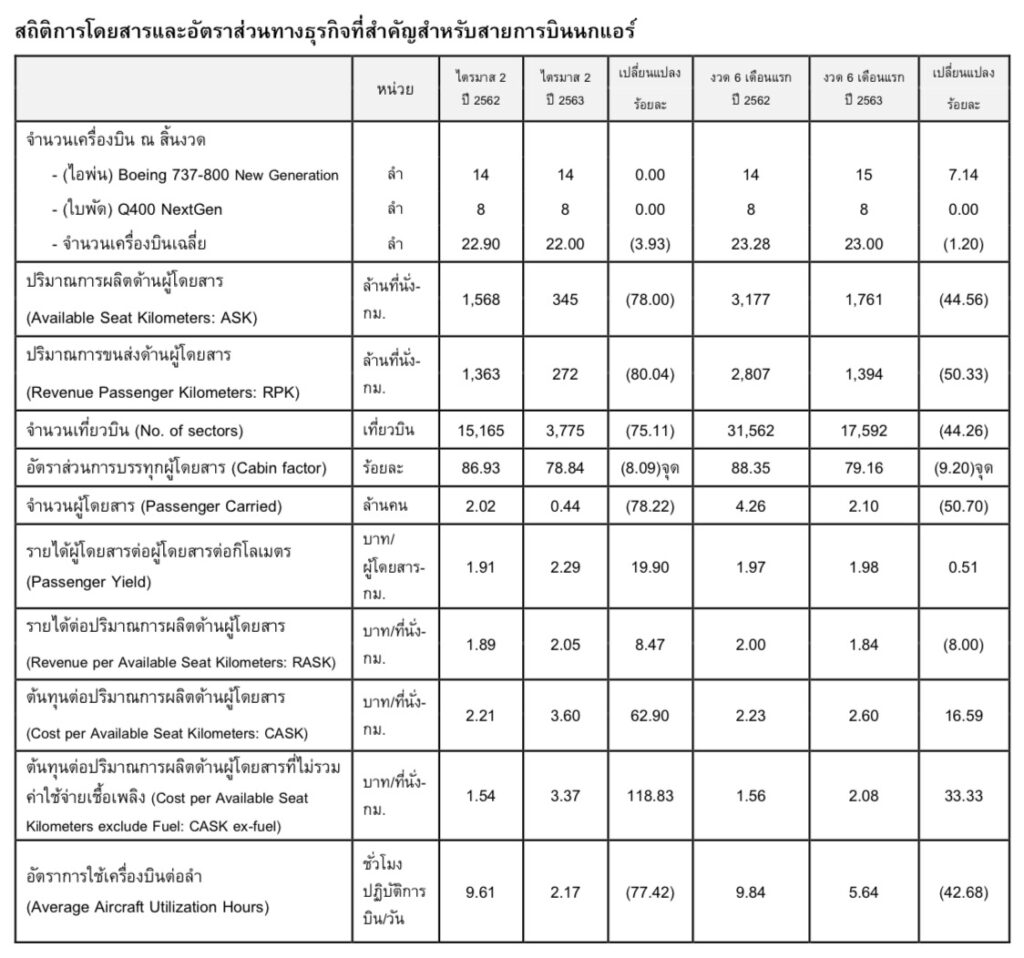 โดยทางบริษัทได้เปิดเผยงบการเงินรวม มีผลขาดทุนสำหรับงวด 6 เดือนปี 2563 จำนวน 3,750.61 ลบ. เปลี่ยนแปลงจากงวดเดียวกันของปีก่อนที่ขาดทุน 1,187.70 ลบ. จากสถานการณ์โควิด-19 ที่มีผลกระทบโดยตรงต่อการเดินทางทางอากาศ