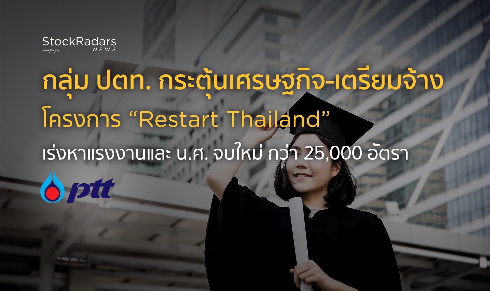 นายอรรถพล ฤกษ์พิบูลย์ ประธานเจ้าหน้าที่บริหารและกรรมการผู้จัดการใหญ่ บริษัท ปตท. จำกัด (มหาชน) (ปตท.) หรือ PTT เปิดเผยว่า กลุ่ม ปตท. พร้อมเร่งเดินหน้าการลงทุนในธุรกิจต่างๆ ทุกโครงการตามแผนงาน เพื่อให้เกิดการจ้างงานในประเทศอย่างต่อเนื่อง และ เตรียมจ้างแรงงานและนักศึกษาจบใหม่รวมกว่า 25,000 อัตราระหว่างปี 2563 – 2564 ภายใต้ โครงการ “Restart Thailand” เพื่อสร้างงาน สร้างรายได้ และสร้างทักษะอาชีพให้กับคนรุ่นใหม่ในทุกภูมิภาค พร้อมสร้างความเข้มแข็งให้กับชุมชนท้องถิ่นและระบบเศรษฐกิจไทย สอดคล้องกับนโยบายของ กลุ่ม ปตท. ในการพัฒนาสังคมและคุณภาพชีวิตของคนไทยให้เติบโตไปด้วยกัน ประกอบด้วย