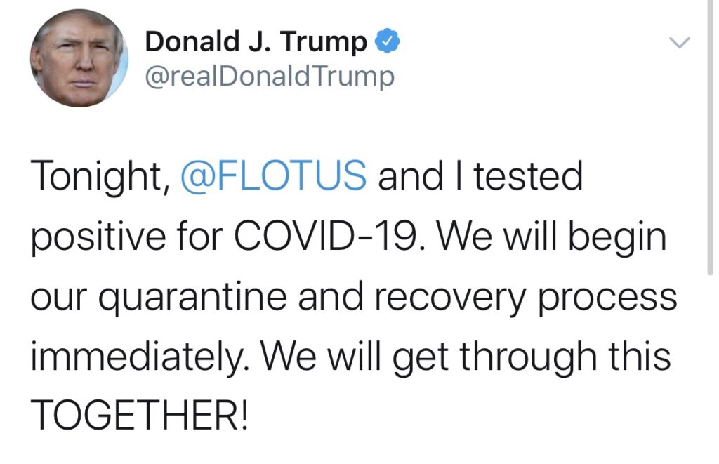 โดยเมื่อซักครู่ ดอนัลด์ ปรัมป์ ประธานาธิบดีสหรัฐฯ เปิดเผยใน twitter ส่วนตัว @realDonaldTrump กล่าวว่า ผลตรวจโควิด-19 ของตนเป็นบวก และขณะนี้กำลังเข้าสู่กระบวนการกักตัว รวมถึงสุภาพสตรีหมายเลขหนึ่ง เมลาเนีย ทรัมป์ ก็มีผลตรวจเป็นบวกด้วย