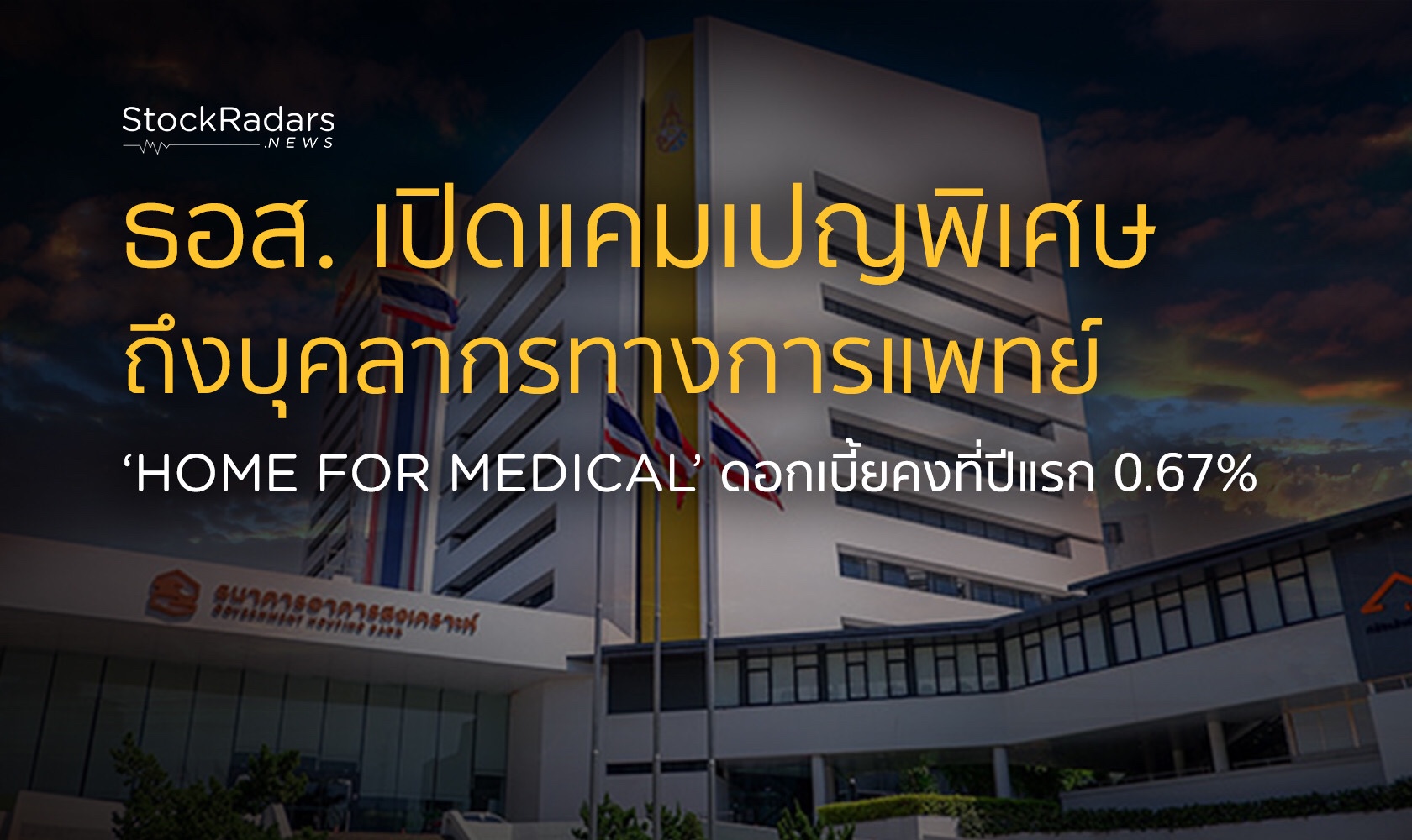 📌 ธอส. เปิดแคมเปญพิเศษ แทนคำขอบคุณกลุ่มบุคลากรทางการแพทย์ที่ปฏิบัติหน้าที่รักษาและป้องกันการแพร่ระบาดของไวรัสโคโรนา 2019 ได้มีที่อยู่อาศัยเป็นของตนเอง จัดทำผลิตภัณฑ์สินเชื่อ “HOME FOR MEDICAL” กรอบวงเงิน 1,000 ล้านบาท อัตราดอกเบี้ยคงที่ปีแรก 0.67% ต่อปี