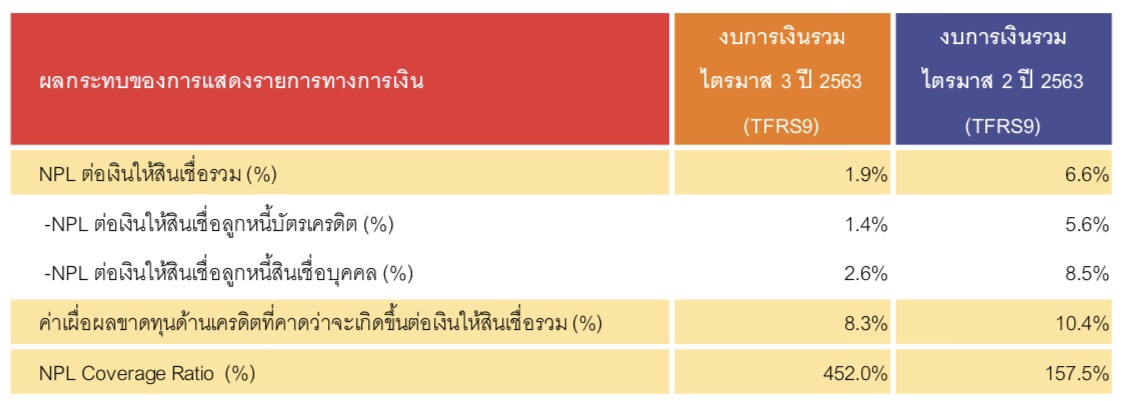 ส่วน NPL รวมในงวด 9 เดือนลดลงเหลือ 1.9% จากไตรมาส 2 ที่เคยมีค่าเท่ากับ 6.6% เป็นผลมาจากการตัดหนี้สูญที่เร็วขึ้น