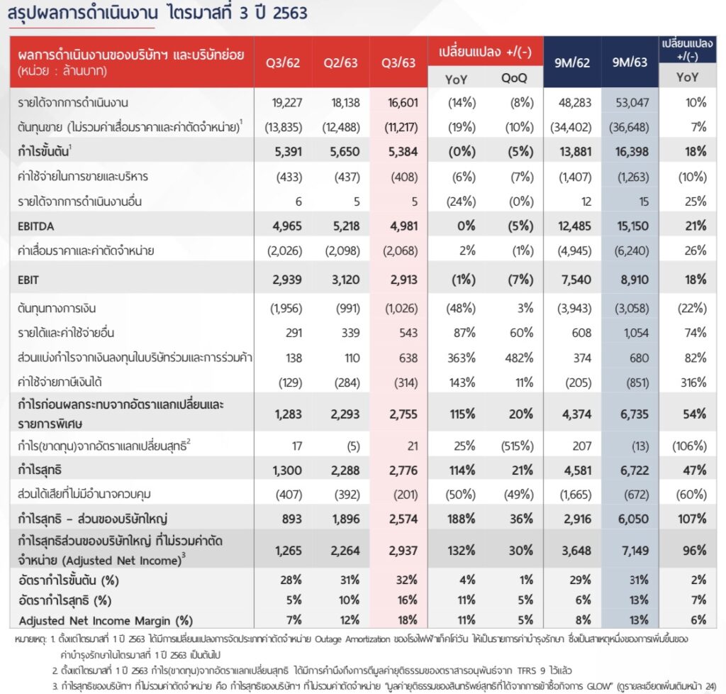 ทั้งนี้ ในไตรมาสที่ 3 เหตุการณ์ที่มีนัยสำคัญต่อผลดำเนินงาน ได้แก่ ก๊าซธรรมชาติและราคาถ่านหินมีการปรับตัวลดลง เมื่อเทียบกับไตรมาสก่อนหน้า ทำให้ต้นทุนขายลดลง ส่งผลเชิงบวกต่อผลดำเนินงานจากการขายไฟฟ้าและไอน้ำให้กับลูกค้าอุตสาหกรรม ถึงแม้ว่าจะมีการปรับลดค่า Ft สำหรับการเรียกเก็บเดือน ก.ย. – ธ.ค. 2563 ลงเล็กน้อย ซึ่งส่งผลให้ราคาขายไฟฟ้าลูกค้าอุตสาหกรรมเฉลี่ยลดลงเล็กน้อยก็ตาม