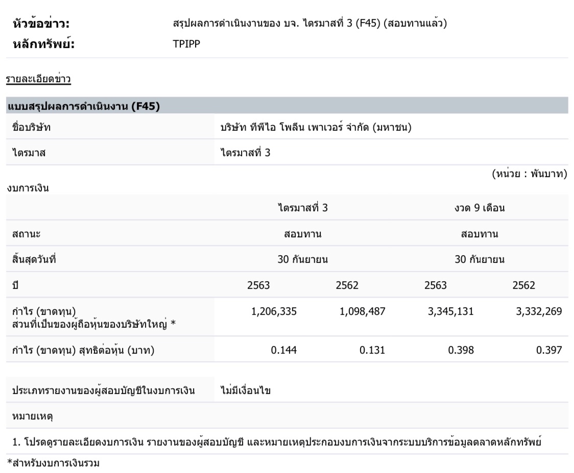 บริษัท ทีพีไอ โพลีน เพาเวอร์ จำกัด (มหาชน) หรือ TPIPP ผู้ดำเนินธุรกิจผลิตและจำหน่ายไฟฟ้า ได้เปิดเผยผลการดำเนินงานงวดไตรมาส 3/2563 มีรายได้จากการขายไฟฟ้าและสินค้า รวมทั้งรายได้ส่วนเพิ่มราคารับซื้อไฟฟ้าเพิ่มขึ้น เนื่องจากมีปริมาณขายไฟฟ้าเพิ่มขึ้น รวมถึงในส่วนของงวด 9 เดือนนั้น ด้วยเช่นกัน