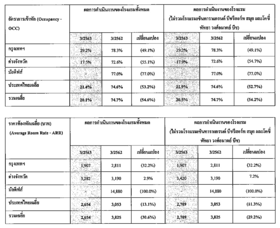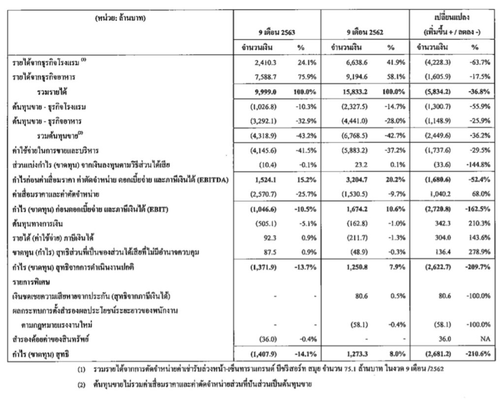 ส่งผลให้รายได้จากธุรกิจโรงแรมของบริษัท ในรอบ 9 เดือนที่ผ่านมา สรุปที่ 2,410.3 ลบ. ลดลง 63.7% YoY และในส่วนของธุรกิจอาหาร รายได้ทั้งหมด 7,588.7 ลบ. ลดลง 17.5% YoY จากการได้รับผลกระทบจากโควิด-19 ส่งผลให้ยอดขายต่อสาขาเดิมลดลงเฉลี่ย 21.9%
