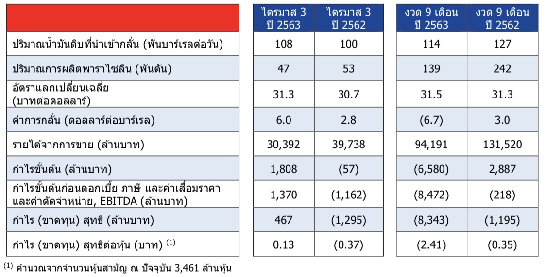 โดยไตรมาสนี้ มีกําไรจากการขายเป็นจํานวน 586 ลบ. เปรียบเทียบกับผลขาดทุนจากการขายจํานวน 1,677 ลบ. ในช่วงเวลาเดียวกันของปี ซึ่งแบ่งเป็นผลกําไรจากส่วนธุรกิจการกลั่นน้ํามันและการจัดจําหน่ายน้ํามันจํานวน 1,069 ล้านบาท อันมีสาเหตุหลักมาจากผลกระทบเชิงบวกของสินค้าคงคลัง และผลขาดทุนจากส่วนธุรกิจปิโตรเคมี จำนวน 483 ลบ.