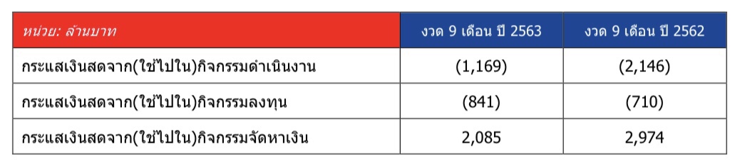 นอกจากนั้น มีกระแสเงินสดใช้ไปในกิจกรรมการดําเนินงานจํานวน 1,169 ลบ. สะท้อนถึงผลขาดทุนสําหรับงวดหักกับผลกระทบเชิงบวกจากเงินทุนหมุนเวียนกระแสเงินสดใช้ไ้ปในกิจกรรมลงทุน 841 ลบ. ซึ่งเป็นผลจากการลงทุนเพื่อสร้างและพัฒนาสถานีบริการน้ํามัน โครงการของโรงกลั่น รวมถึงเงินสดจ่ายเพื่อได้มาในสินทรัพย์สิทธิการใช้ หักลบบางส่วนกับเงินปันผลรับจากการลงทุน กระแสเงินสดจากกิจกรรมจัดหาเงินจํานวน 2,085 ล้านบาท ซึ่งส่วนใหญ่มาจากเงินกู้ยืมสุทธิ