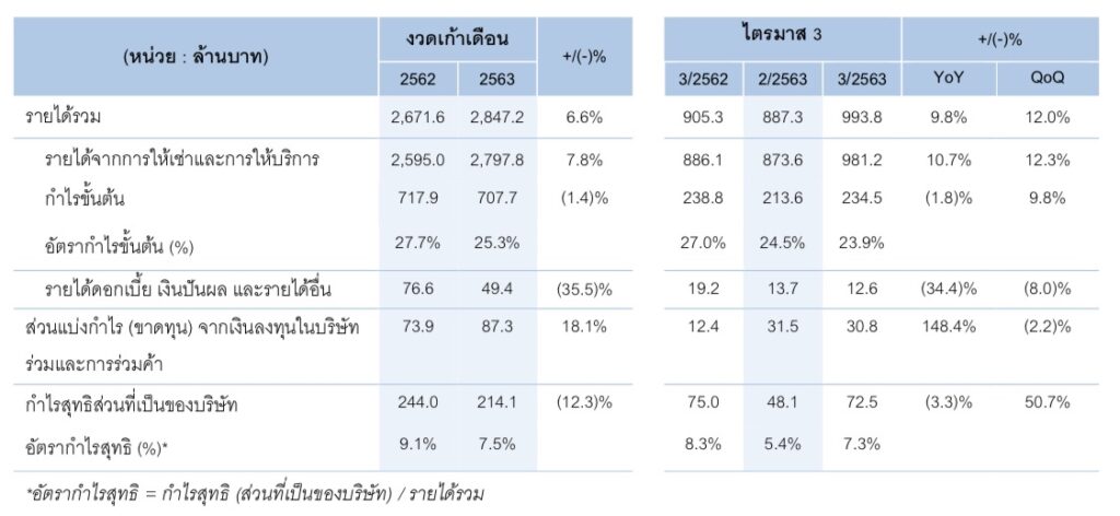 และงวดเก้าเดือนนั้น มีรายได้รวมจำนวน 2,847.2 ล้านบาท เพิ่มขึ้นจำนวน 175.6 ล้านบาท หรือคิดเป็น 6.6% YoY แบ่งเป็นรายได้ค่าเช่าและรายได้จากการบริการรวมทั้งสิ้น 2,797.8 ล้านบาท เพิ่มขึ้น 202.8 ล้านบาท หรือ 7.8% ส่วนกำไรสุทธิ อยู่ที่ 214.1 ลบ. ลดลงจาก 244 ลบ. หรือ -12.3% YoY