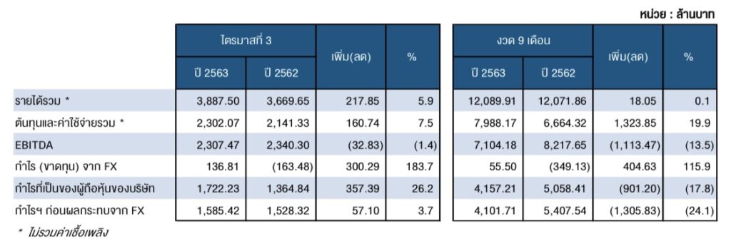 ทั้งนี้ หากไม่รวมผลกระทบจาก FX ผลการดําเนินงานของบริษัทฯ และบริษัทย่อยสําหรับงวด 9 เดือนของปี 2563 มีกําไรจํานวน 4,101.71 ล้านบาท