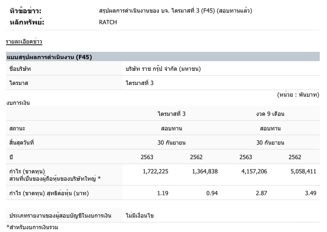 บริษัท ราช กรุ๊ป จำกัด (มหาชน) หรือ RATCH ได้เปิดเผยผลการดำเนินงานในไตรมาสที่ 3 ของปี 2563 กําไรส่วนที่เป็นของบริษัทฯ จํานวน 1,722.23 ล้านบาท เพิ่มขึ้น จากงวดเดียวกันของปีก่อนจํานวน 357.39 ล้านบาท สาเหตุหลักเนื่องจากผลกระทบจากอัตราแลกเปลี่ยน (FX) ซึ่งทําให้กําไรเพิ่มขึ้น จํานวน 300.29 ล้านบาท ทั้งนี้ หากไม่รวมผลกระทบจาก FX ผลการดําเนินงานของบริษัทฯ และบริษัทย่อยสําหรับ มีกําไรจํานวน 1,585.42 ล้านบาท