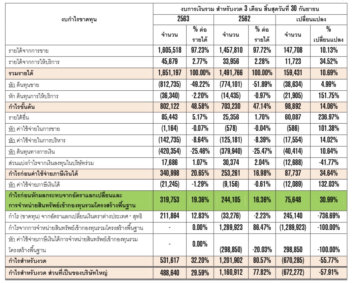 ซึ่งหากไม่นําผลกระทบจากอัตราแลกเปลี่ยนเงินตราต่างประเทศและการจําหน่ายสินทรัพย์เข้ากองทุนรวมโครงสร้างพื้นฐาน บริษัทฯ จะมีกําไรสําหรับงวด 9 เดือน ปี 2563 เท่ากับ 1,130.639 ลบ. เพิ่มขึ้น 5.84% YoY