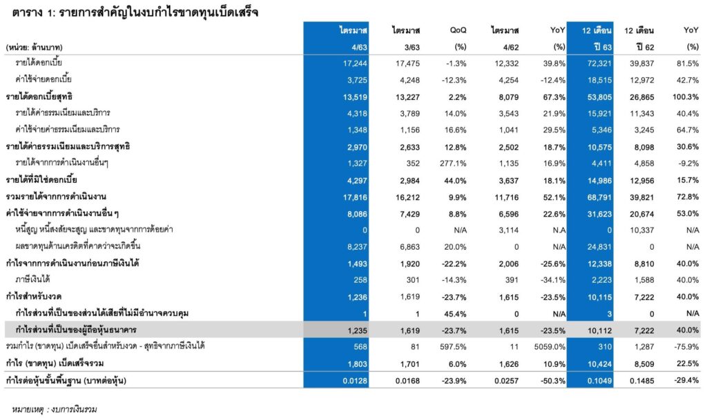 ซึ่งในขณะที่ส่วนต่างรายได้ดอกเบี้ย (NIM) ปรับตัวดีขึ้น อยู่ที่ 3.00% ในปี 2563 จาก 2.81% จากช่วงเวลาเดียวกันของปีก่อน แม้ว่ามีการปรับลดอัตราดอกเบี้ยเงินกู้ขั้นต่ำหลายครั้งและปรับการคำนวณดอกเบี้ยแท้จริง (EIR) ภายใต้โปรแกรมช่วยเหลือสำหรับลูกค้าที่ได้รับผลกระทบจากโควิด-19 โดยปัจจัยหลักมาจากอัตราผลตอบแทนจากสินทรัพย์ที่ก่อให้เกิดรายได้เพิ่มขึ้น จากการควบรวมกิจการกับธนาคารธนชาต และการปรับโครงสร้างงบดุลให้มีความเหมาะสม