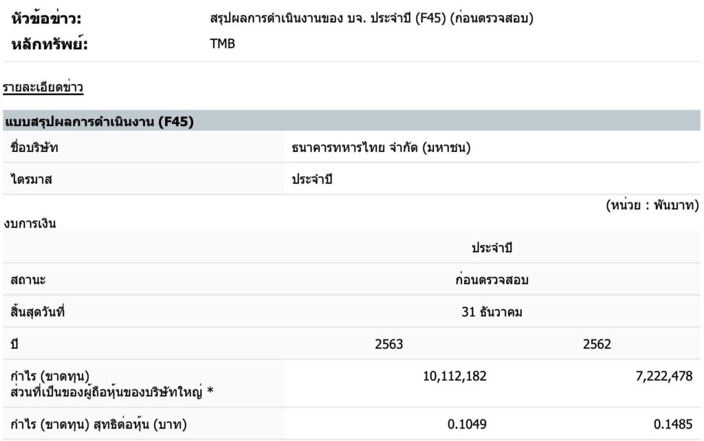ธนาคารทหารไทย จำกัด (มหาชน) หรือ TMB แจ้งให้ทราบถึงผลการดำเนินงานของบริษัทฯ โดยได้กล่าวถึงภาวะเศรษฐกิจไทยในปี 2563 หดตัวอย่างรุนแรงจากสถานการณ์การระบาดของโควิด-19 โดยมีการฟื้นตัวอย่างค่อยเป็นค่อยไป ซึ่งทีเอ็มบียังคงเติบโตสินเชื่อเงินฝากอย่างระมัดระวัง เพื่อมั่นใจในคุณภาพของพอร์ต