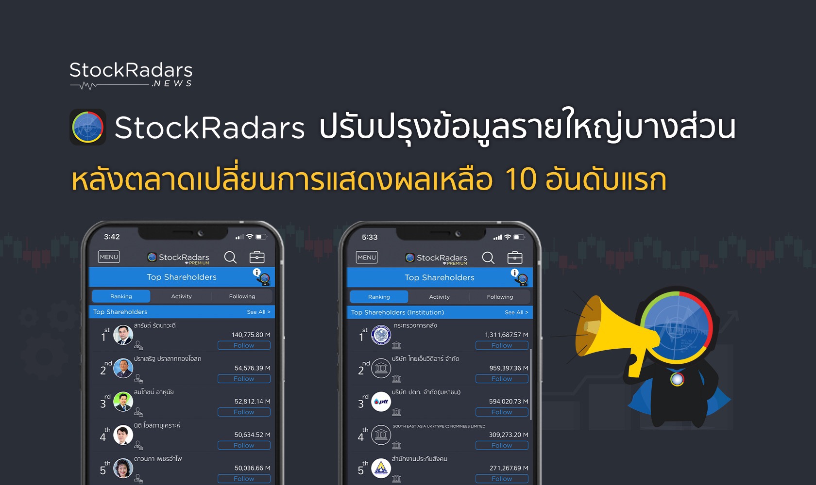 โดยการปรับการแสดงผลดังกล่าว ส่งผลให้ข้อมูลบางส่วนคลาดเคลื่อน ทาง StockRadars จึงขออนุญาตประกาศปรับปรุงบริการข้อมูล Top Shareholders บางรายการในแอพพลิเคชั่น เช่น รายงานการเปลี่ยนแปลงผู้ถือหลักทรัพย์ (Noticeable Transaction) การเข้าออกจากรายชื่อผู้ถือหุ้นรายใหญ่ (In-Out of Shareholding) โปรไฟล์แสดงมูลค่าพอร์ตลงทุนของผู้ถือหุ้นรายใหญ่บางราย และ การแสดงถึงการออกจากผู้ถือหุ้นใหญ่บนกราฟแท่งเทียน (Event on Chart)