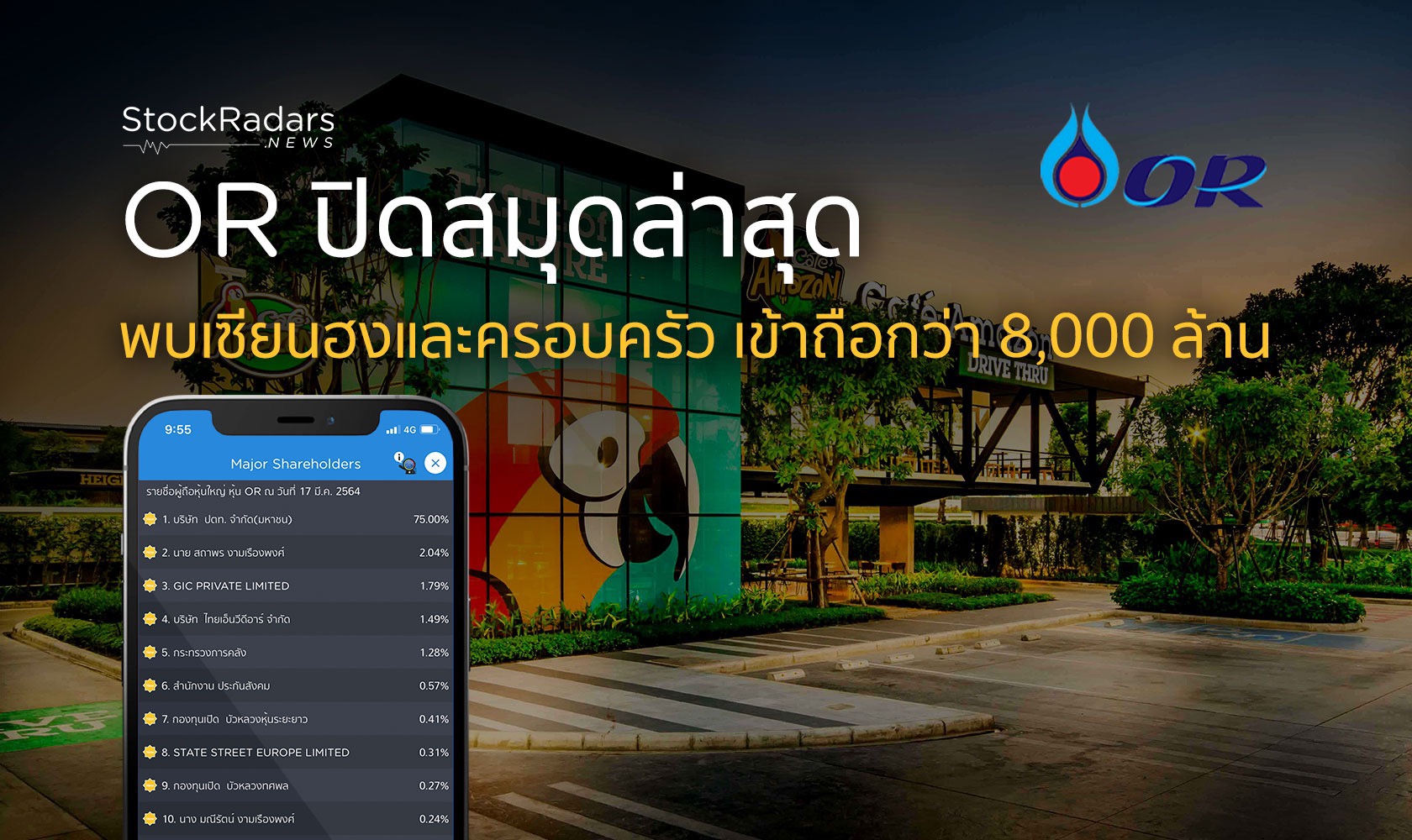 ล่าสุด บริษัท ปตท. น้ำมันและการค้าปลีก จำกัด (มหาชน) หรือ OR ปิดสมุดทะเบียนในวันที่ 17 มี.ค. 64 สรุปจำนวนผู้ถือหุ้นทั้งหมด 406,960 ราย พบเซียนฮง สถาพร งามเรืองพงศ์ เก็บ OR เข้าเป็นผู้ถือหุ้นรายใหญ่อันดับสอง รองจากผู้ถือหุ้นอันดับหนึ่งคือ ปตท. ด้วยจำนวนหุ้นรวม 244,298,900 หุ้น คิดเป็นสัดส่วน 2.04% พร้อมทั้งนางมณีรัตน์ งามเรืองพงศ์ เข้าถือ 29,000,000 หุ้น คิดเป็น 0.24% โดย ณ ราคาล่าสุดในวันนี้ (23 มี.ค. 63) ทำให้มูลค่าการถือรวมสูงถึง 8,000 ล้านบาท