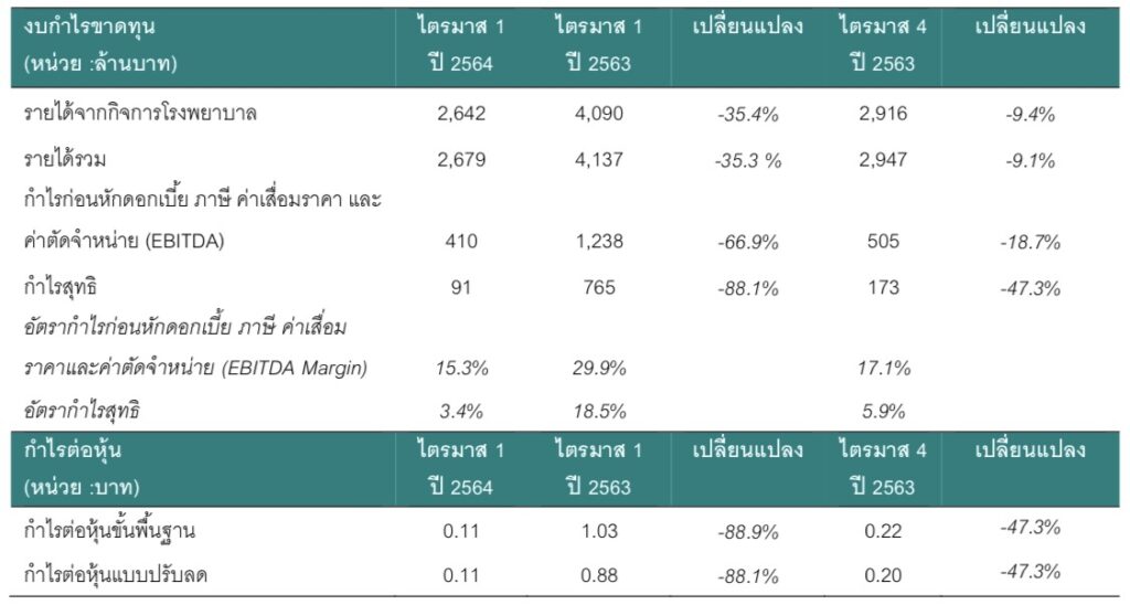 โดยในไตรมาส 1 ปี 2564 บริษัทมีรายได้จากกิจการโรงพยาบาลจํานวน 2,642 ล้านบาท ลดลง 35.4% จาก 4,090 ล้านบาท ในไตรมาส 1 ปี 2563 โดยหลักเป็นผลจากการลดลงของรายได้จากกลุ่มผู้ป่วยชาวต่างประเทศ 54.4% หักลบกับการเพิ่มขึ้นจากรายได้กลุ่มผู้ป่วยชาวไทย 0.5% เป็นผลให้รายได้จากกลุ่มผู้ป่วยชาวไทยคิดเป็น 53.9% จากทั้งหมด