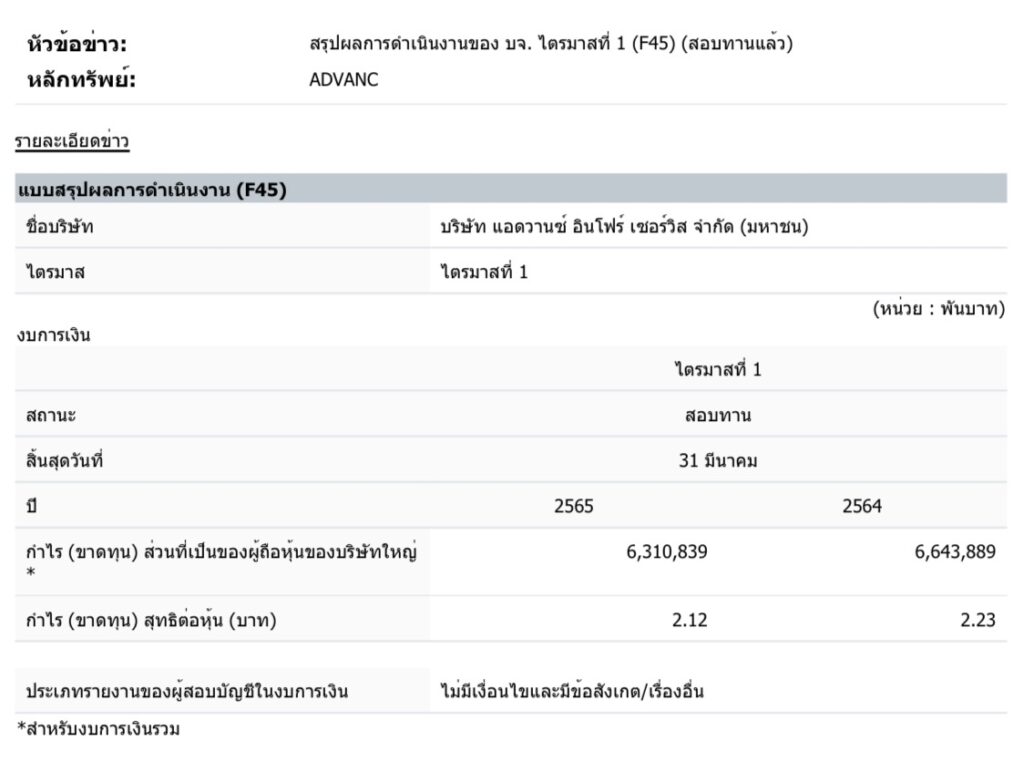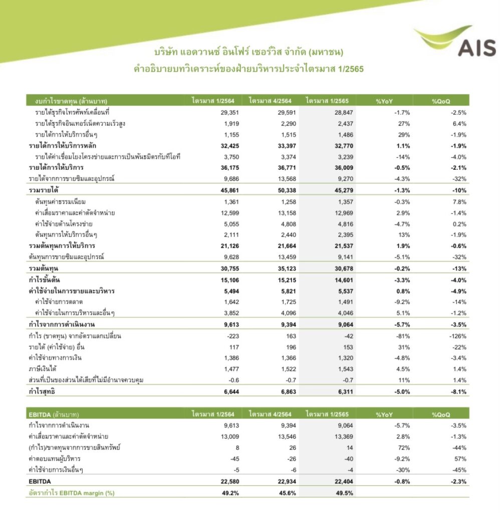 RADARS: 📱ADVANC ปล่อยงบ Q1/65 กำไรสุทธิแตะ 6.3 พันลบ. ลูกค้าเพิ่มขึ้นกว่า 5 แสนเลขหมาย