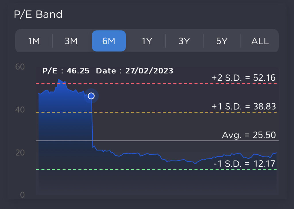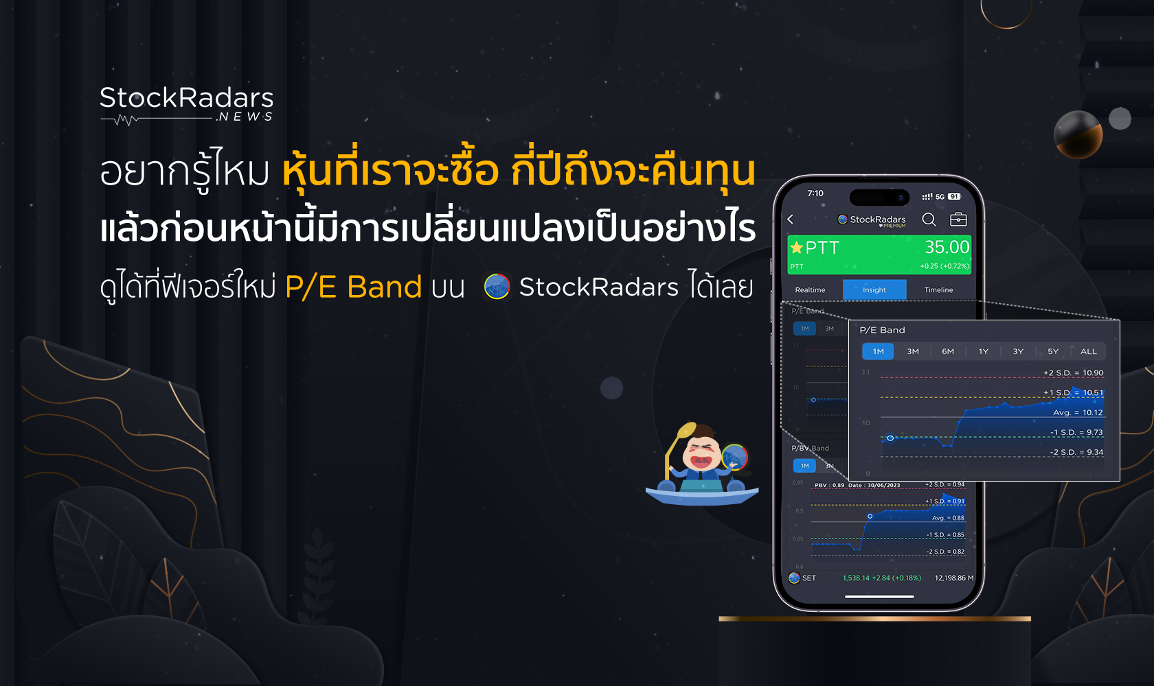 💫 ความพิเศษของฟีเจอร์ P/E Band ที่ StockRadars คือให้เราสามารถดูค่า P/E ย้อนหลังได้ เพื่อดูการเปลี่ยนแแปลง ตั้งแต่ 1M, 3M, 6M, 1Y, 3Y และ 5Y ซึ่งก็คือช่วงเวลา 1 เดือน, 3 เดือน, 6 เดือน, 1 ปี, 3 ปี และ 5 ปี หรือ All เพื่อดูภาพรวมค่าทั้งหมด ซึ่งเราสามารถกดที่กราฟเพื่อดูค่า P/E ของแต่ละวันตามที่ต้องการได้เลย จะมีบอกค่า S.D. หรือค่ามาตรฐาน ประกอบด้วย +2, +1, Avg. และ -1 S.D. เปรียบเทียบบนกราฟให้อีกด้วย