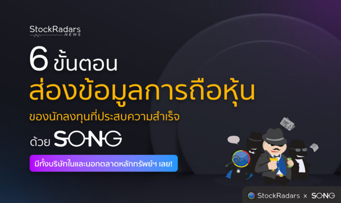 “ส่อง (SONG)” เป็นแพลตฟอร์มที่เปิดให้ทุกคนได้เรียนรู้พฤติกรรมจริงของนักลงทุน และให้เห็นความเชื่อมโยงของบริษัท โดยมีข้อมูลการถือหุ้นบริษัทต่างๆ ของนักลงทุนทั่วไป และผู้ถือหุ้นรายใหญ่ 100 อันดับแรกในตลาดหลักทรัพย์ไทย ซึ่งประกอบด้วย