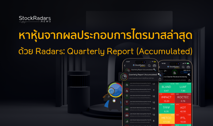 ทุกไตรมาส บริษัทจดทะเบียนจะรายงานผลประกอบการ ซึ่งเป็นข้อมูลสำคัญที่ช่วยให้นักลงทุนตัดสินใจได้ว่า หุ้นตัวไหนยังเติบโต หรือ หุ้นตัวไหนเริ่มเสียทรง แต่การนั่งไล่เช็กงบการเงินทีละบริษัทอาจเป็นเรื่องยุ่งยาก และเสียเวลา ด้วย Radars: Quarterly Report (Accumulated) ฟีเจอร์ที่ช่วยให้เพื่อน ๆ หาหุ้นโดยดูจากผลประกอบการว่ามีการเพิ่มขึ้น หรือลดลงอย่างไรในไตรมาสล่าสุดได้ในที่เดียว