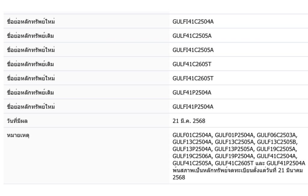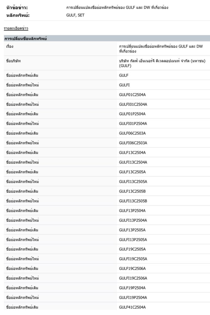 • GULF19P2504A → GULFI19P2504A และอื่น ๆ ตามรายละเอียดที่ประกาศจากตลาดหลักทรัพย์ฯ