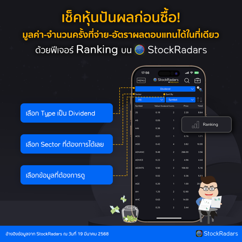 ✨ ใครกำลังมองหาหุันปันผล เข้าไปเช็คข้อมูลกันได้นะครับที่เมนู Ranking บน StockRadars ได้เลยครับผม