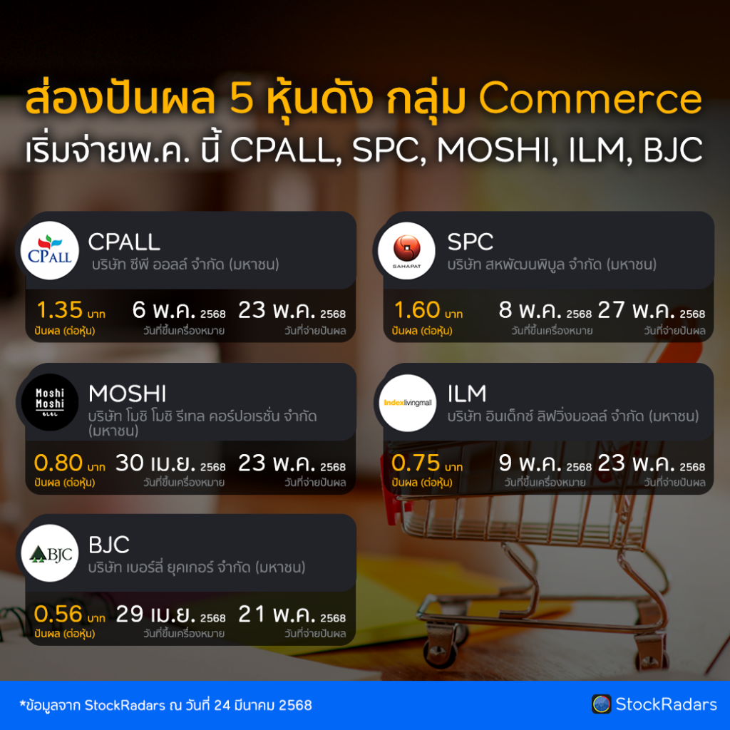 พฤษภาคมนี้ หุ้นในกลุ่มพาณิชย์ (Commerce) หลายตัวเริ่มทยอยขึ้นเครื่องหมาย XD และเตรียมจ่ายปันผลให้กับผู้ถือหุ้นอย่างต่อเนื่อง วันนี้ StockRadars รวบรวม 5 หุ้นดังในกลุ่ม Commerce ได้แก่ CPALL, SPC, MOSHI, ILM และ BJC ที่วันขึ้นเครื่องหมาย ในช่วงเดือนเมษายนถึงต้นพฤษภาคม และจะเริ่มจ่ายปันผลภายในเดือนพฤษภาคมมาให้แล้ว