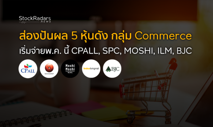 พฤษภาคมนี้ หุ้นในกลุ่มพาณิชย์ (Commerce) หลายตัวเริ่มทยอยขึ้นเครื่องหมาย XD และเตรียมจ่ายปันผลให้กับผู้ถือหุ้นอย่างต่อเนื่อง วันนี้ StockRadars รวบรวม 5 หุ้นดังในกลุ่ม Commerce ได้แก่ CPALL, SPC, MOSHI, ILM และ BJC ที่วันขึ้นเครื่องหมาย ในช่วงเดือนเมษายนถึงต้นพฤษภาคม และจะเริ่มจ่ายปันผลภายในเดือนพฤษภาคมมาให้แล้ว