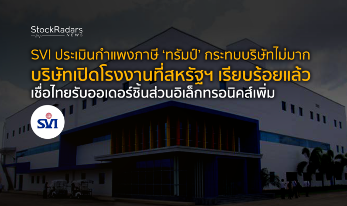 SVI ผู้ประกอบธุรกิจให้บริการแบบครบวงจรในการประกอบผลิตภัณฑ์ประเภทวงจรไฟฟ้า และผลิตภัณฑ์อิเล็กทรอนิคส์สำเร็จรูปให้แก่ลูกค้าในภาคอุตสาหกรรม ประเมินสหรัฐเก็บภาษีนำเข้าสินค้าไทย 36% กระทบต่อธุรกิจเล็กน้อย หากเทียบกับประเทศเพื่อนบ้านที่โดนเก็บภาษีสูงกว่า โดยเฉพาะจีน หนุนออเดอร์ยังไหลเข้าไทยต่อเนื่อง แถมเปิดโรงงานที่สหรัฐไว้เรียบร้อยแล้ว เพื่อบริหารความเสี่ยงจากความไม่แน่นอนของการค้าโลก