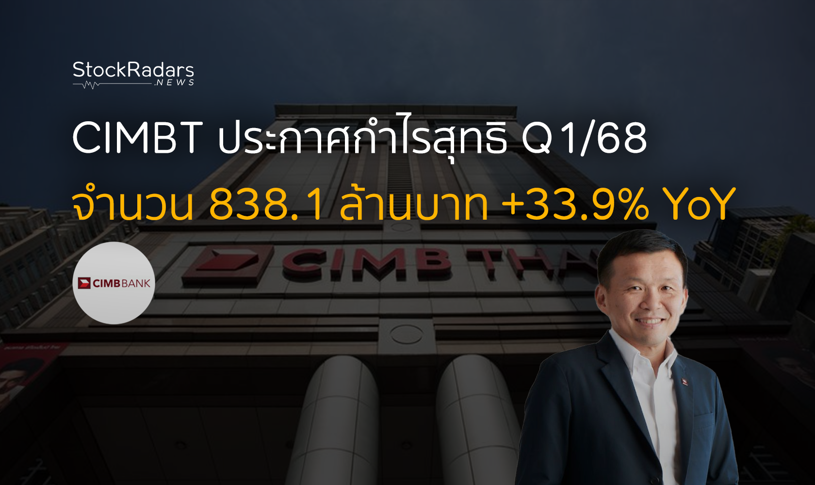 ธนาคาร ซีไอเอ็มบี ไทย หรือ CIMBT เปิดเผยผลการดำเนินงานของกลุ่มธนาคาร สำหรับงวดสามเดือนสิ้นสุดวันที่ 31 มีนาคม 2567 มีกำไรสุทธิจำนวน 838.1 ล้านบาท เพิ่มขึ้นจำนวน 212.0 ล้านบาท หรือร้อยละ 33.9 เมื่อเปรียบเทียบผลกำไรสุทธิของงวดเดียวกันปี 2567 สาเหตุหลักเกิดจากรายได้จากการดำเนินงานเพิ่มขึ้นร้อยละ 2.2 และการควบคุมค่าใช้จ่ายที่ดีขึ้นส่งผลให้ค่าใช้จ่ายในการดำเนินงานลดลงร้อยละ 22.1 ในขณะที่ผลขาดทุนด้านเครดิตที่คาดว่าจะเกิดขึ้นเพิ่มขึ้นร้อยละ 58.2