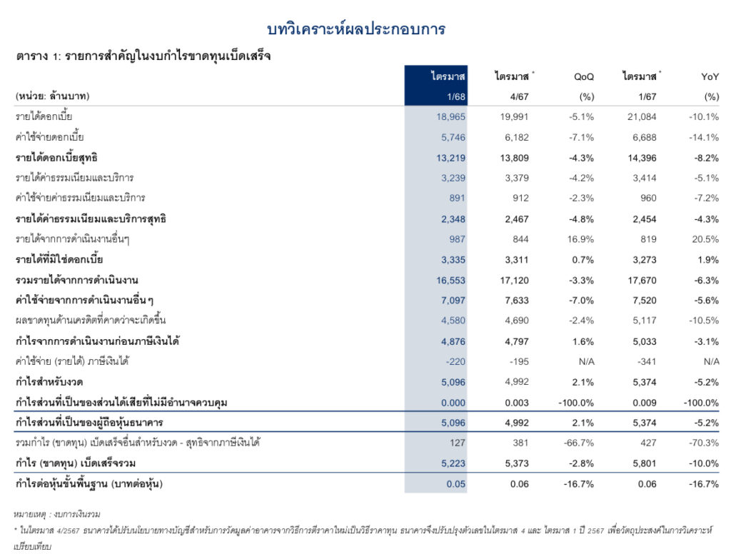 ค่าใช้จ่ายในการดำเนินงาน ลดลงร้อยละ 7 QoQ ส่งผลให้ อัตราส่วนต้นทุนต่อรายได้ (C/I) ปรับตัวลงมาอยู่ที่ร้อยละ 43 ในไตรมาส 1/2568 จากร้อยละ 44 ในไตรมาส 4/2567 สะท้อนให้เห็นผลจากการปรับโครงสร้างธุรกิจสู่ Digital-first การมีวินัยด้านค่าใช้จ่าย และการเพิ่มประสิทธิภาพในการดำเนินงาน