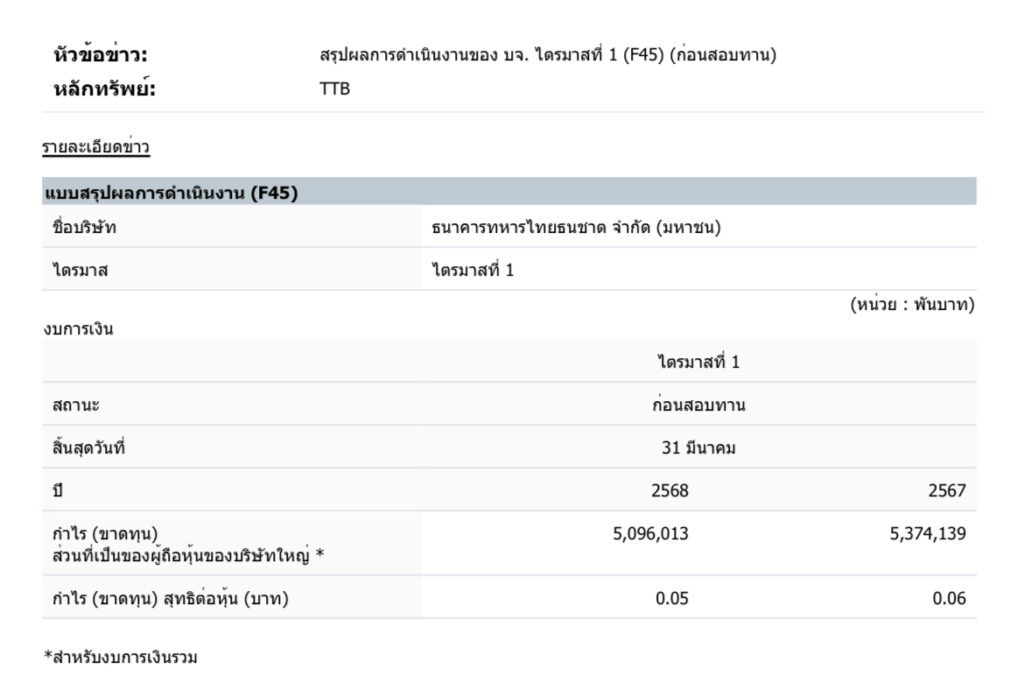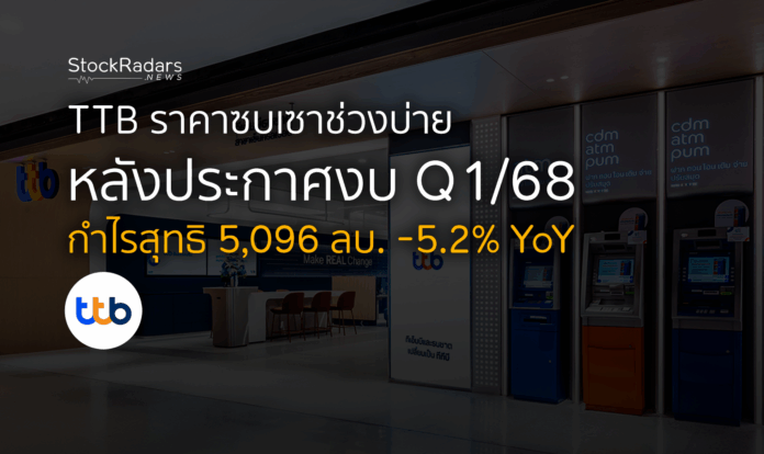 ล่าสุด ธนาคารทหารไทยธนชาต จำกัด (มหาชน) หรือ TTB เปิดเผยงบการเงินประจำไตรมาส 1/2568 แสดงกำไรสุทธิหลังค่าใช้จ่ายสำรองฯ และผลประโยชน์ทางภาษีอยู่ที่ 5,096 ล้านบาท เพิ่มขึ้นร้อยละ 2.1 จากไตรมาสก่อนหน้า แต่ลดลงร้อยละ 5.2 จากช่วงเวลาเดียวกันปีก่อน ซึ่งเทียบเป็นอัตราผลตอบแทนต่อส่วนของผู้ถือหุ้น หรือ ROE อยู่ที่ร้อยละ 8.6 ค่อนข้างทรงตัวจากไตรมาส 4/2567 ที่ร้อยละ 8.4 แต่ลดลงเมื่อเทียบกับร้อยละ 9.4 จากช่วงเวลาเดียวกันปีก่อน