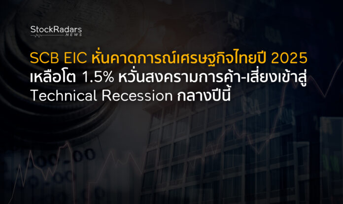 SCB EIC ปรับลดคาดการณ์เศรษฐกิจไทยปี 2025 เหลือ 1.5% จากเดิม 2.4% หลังประเมินว่า ความเสี่ยงจากสงครามการค้ารอบใหม่ และความไม่แน่นอนทางเศรษฐกิจโลกจะกดดันเศรษฐกิจไทยอย่างมีนัยสำคัญ เสี่ยงเผชิญภาวะ Technical Recession ช่วงกลางปีนี้
