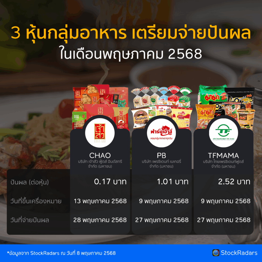 สำหรับนักลงทุนที่มองหาหุ้นปันผลช่วงไตรมาสนี้ อย่ามองข้ามหุ้นในกลุ่มอาหาร เพราะหลายบริษัทเริ่มประกาศจ่ายเงินปันผลให้ผู้ถือหุ้นแล้ว เรารวบรวมรายชื่อหุ้นเด่นในกลุ่มนี้ที่เตรียมขึ้นเครื่องหมาย XD และจ่ายปันผลในเดือนพฤษภาคม 2568 ไว้ให้แล้ว เช็กเลยว่ามีตัวไหนอยู่ในพอร์ตคุณบ้าง👇