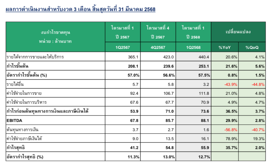กำไรสุทธิ 55.9 ล้านบาท เติบโต 2% QoQ และ 35.7% YoY โดยปัจจัยส่งเสริมการเติบโตมาจากกลยุทธ์การตลาดเชิงรุกแบบ 360 องศา ทั้งออฟไลน์และออนไลน์ ควบคู่กับการสร้าง Brand Awareness ด้วยการทำโฆษณาผ่านพรีเซนเตอร์และอินฟลูเอนเซอร์รวมทั้งการจัดโปรโมชันส่งเสริมการขาย การออกบูธแสดงสินค้าในงานวิชาการต่างๆ