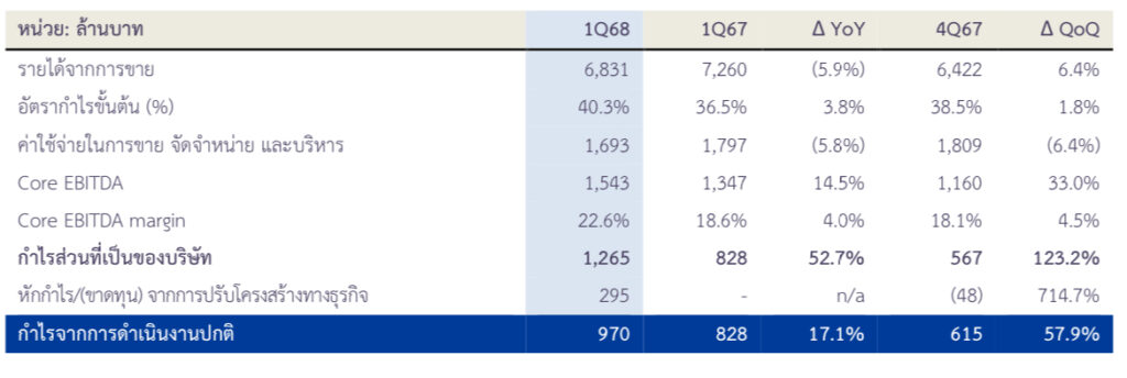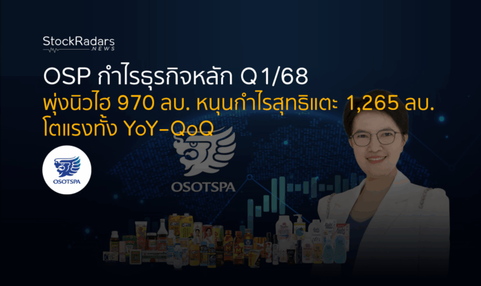 “โอสถสภา” รายงานกำไรจากธุรกิจหลักไตรมาส 1/2568 ที่ 970 ล้านบาท สูงสุดนับตั้งแต่เข้าตลาดฯ โต 17.1% YoY และ 57.9% QoQ จากการบริหารต้นทุนที่มีประสิทธิภาพ พร้อมรับรู้กำไรพิเศษจากการปรับโครงสร้างธุรกิจ ดันกำไรสุทธิแตะ 1,265 ล้านบาท โต 52.7% YoY รายได้จากการขาย 6,831 ล้านบาท เพิ่มขึ้น 6.4% QoQ โดยเฉพาะตลาดต่างประเทศที่เติบโตโดดเด่น เดินหน้าแผนบริหารต้นทุน สร้างฐานธุรกิจระยะยาว