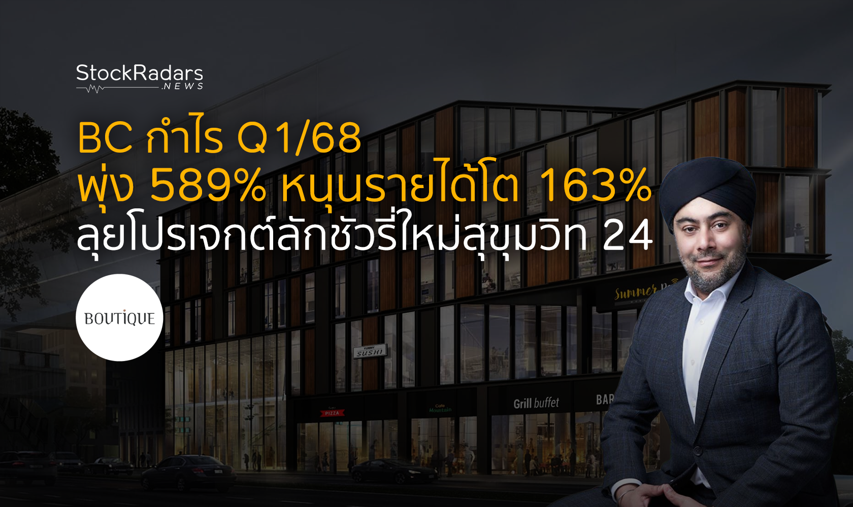BC รายงานกำไรจากการดำเนินงานไตรมาส 1/68 พุ่ง 589% อยู่ที่ 152.9 ล้านบาท หนุนโดยกำไรจากการขายเงินลงทุนในโครงการ Summer Point รับรู้กำไรทันที 213.6 ล้านบาท ดันรายได้รวมโต 163% แตะ 347 ล้านบาท พร้อมแรงส่งจากธุรกิจโรงแรม ศูนย์การค้า และออฟฟิศให้เช่าที่ฟื้นตัวดีต่อเนื่อง ภายใต้โมเดล “สร้าง-ดำเนินการ-ขาย” (BOS) ขณะที่ผู้บริหารเตรียมเปิดตัวโปรเจกต์โรงแรมลักชัวรี่ใหม่ย่านสุขุมวิท 24 ภายในปีนี้