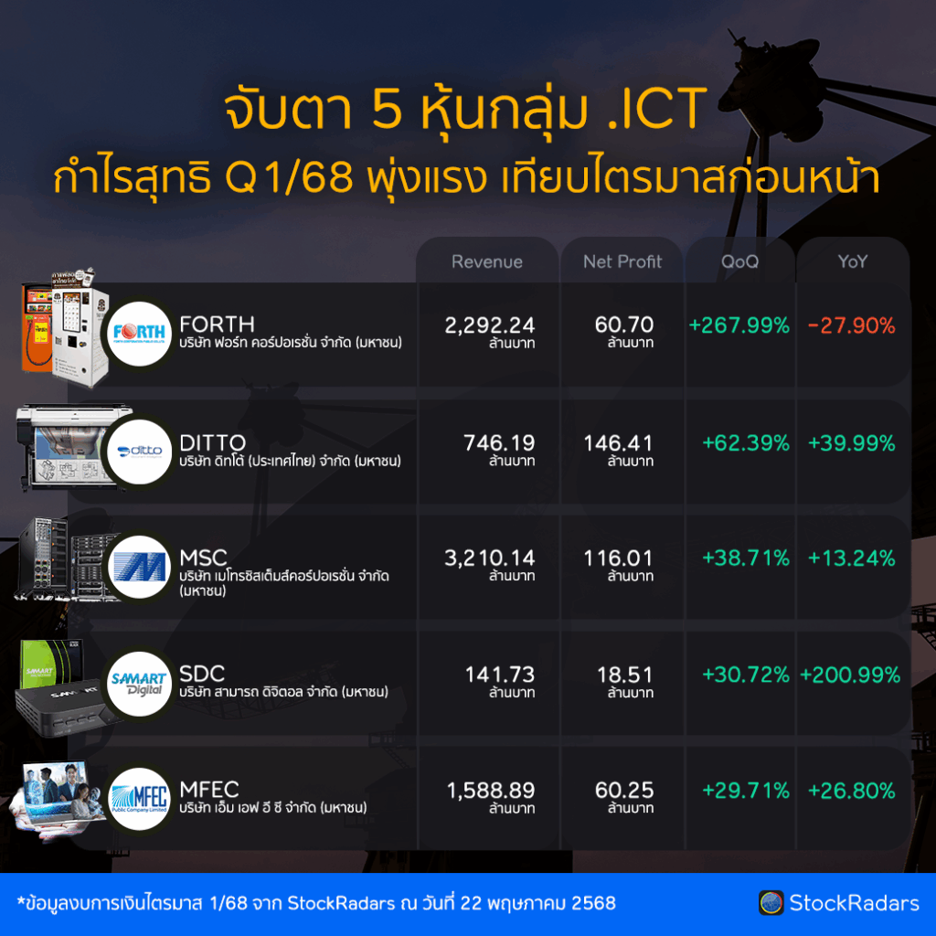หลังจากที่หลายบริษัททยอยประกาศผลประกอบการไตรมาส 1 ปี 2568 กันอย่างต่อเนื่อง นักลงทุนเริ่มหันมาโฟกัสกลุ่มที่มีแนวโน้มเติบโตชัดเจน หนึ่งในนั้นคือ กลุ่มเทคโนโลยีสารสนเทศและการสื่อสาร (.ICT) ซึ่งถือเป็นหัวใจสำคัญของโครงสร้างเศรษฐกิจยุคใหม่ ทั้งในภาคธุรกิจเอกชน ภาครัฐ และการเปลี่ยนผ่านสู่เศรษฐกิจดิจิทัล